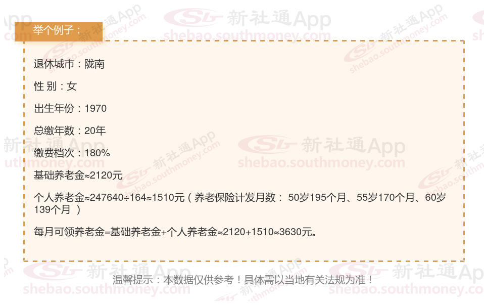 个人养老金:个人账户养老金等于养老保险个人账户的余额÷退休年龄确定的计发月数。通过公式计算出每月大约1510元。