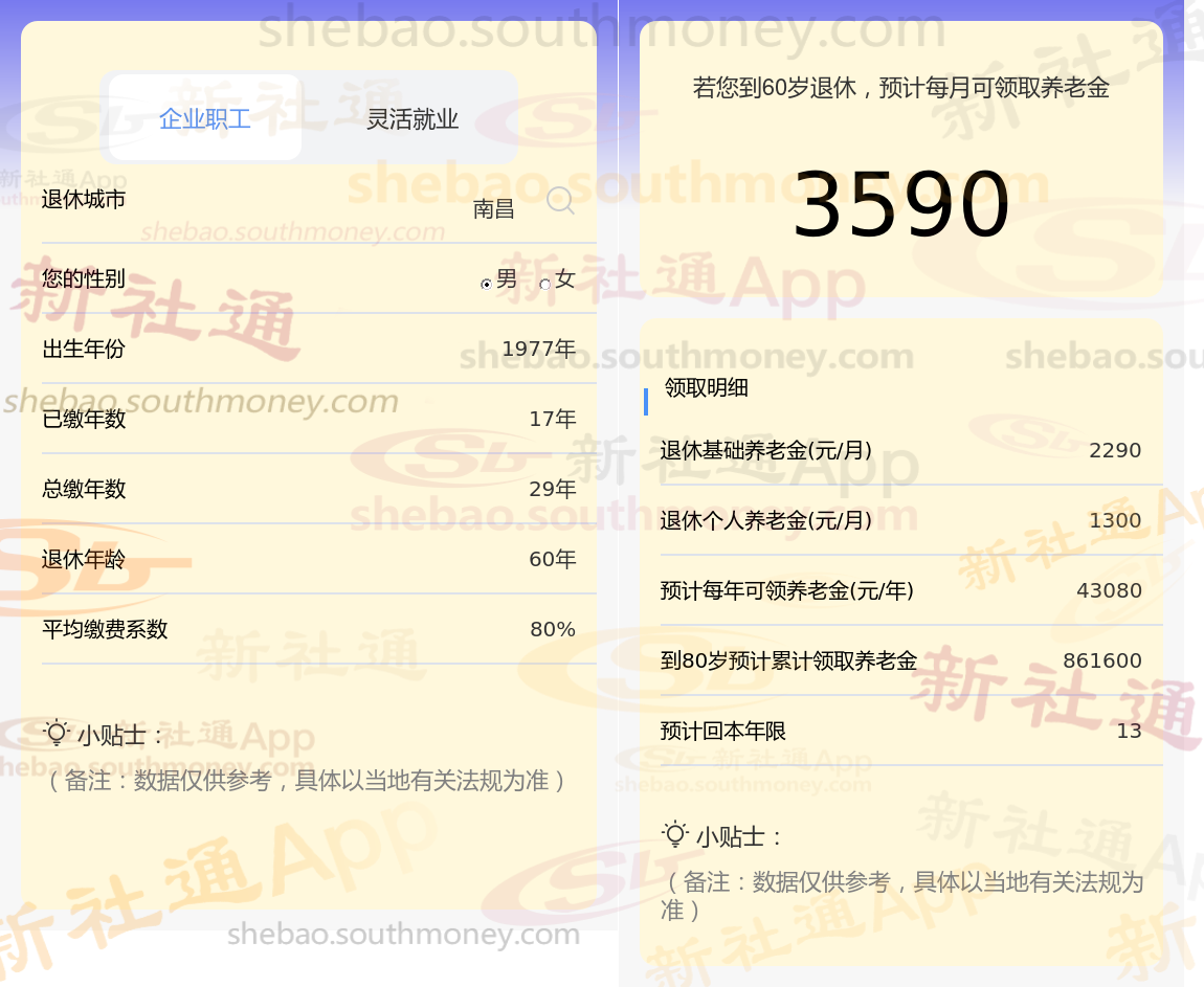 通过新社通APP-养老金计算所得:退休城市、出生年份、退休年龄、缴费系数都相同的情况下,社保缴费年限累计29年时,计算如下: