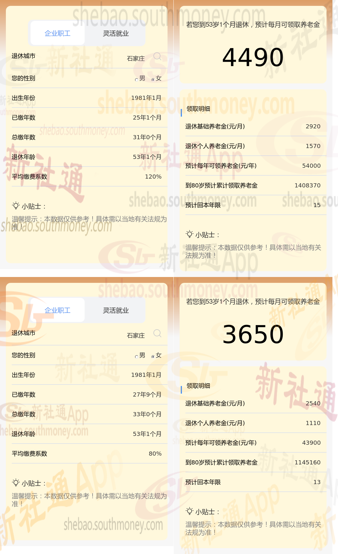 下面新社丫丫一起来看下,以河北石家庄为例(不考虑过渡养老金):