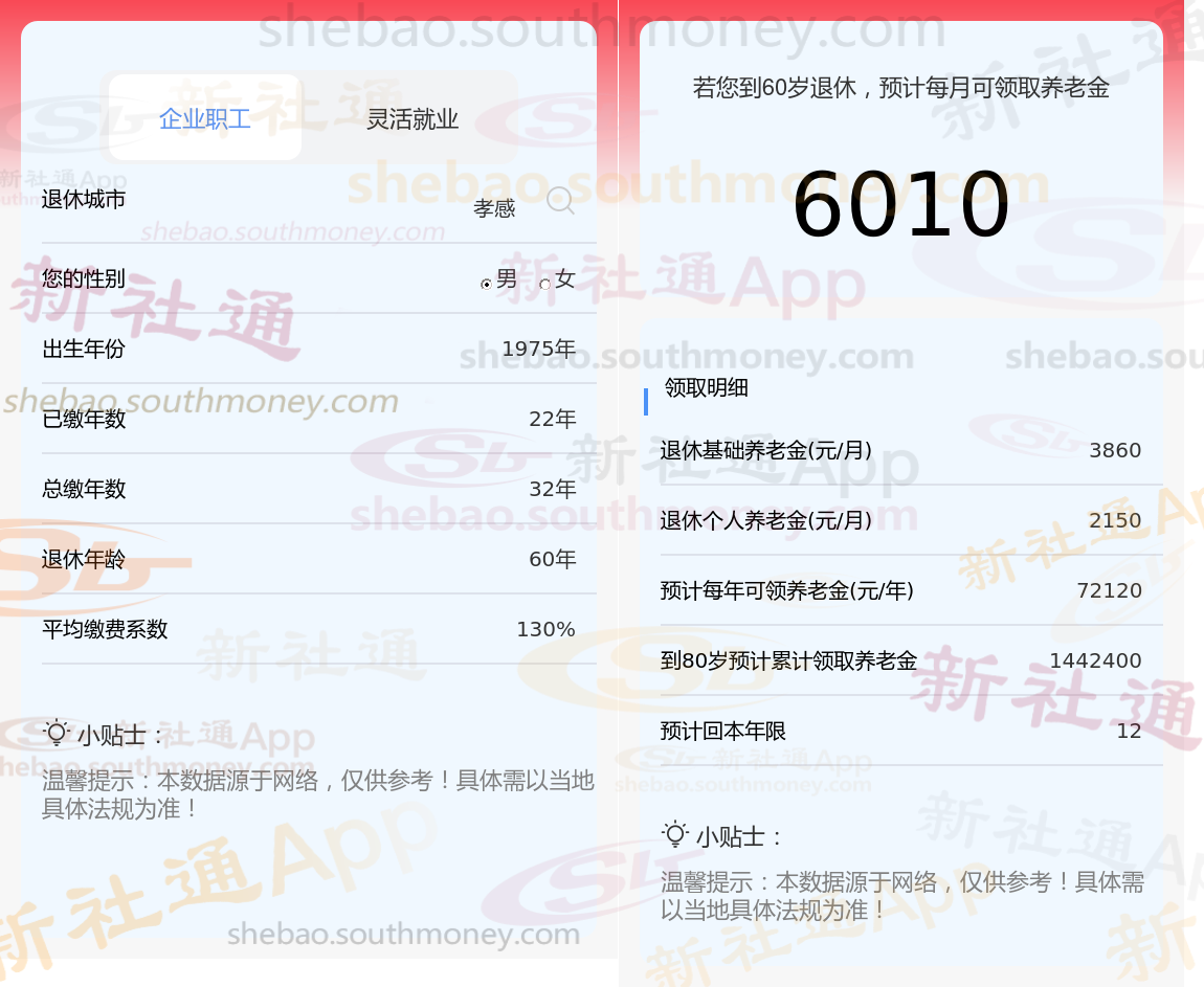 通过新社通APP-养老金计算所得:退休城市、出生年份、退休年龄、缴费系数都相同的情况下,社保缴费年限累计32年时,计算如下:
