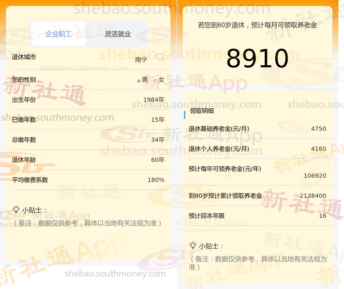 通过新社通APP-养老金计算所得:退休城市、出生年份、退休年龄、缴费系数都相同的情况下,社保缴费年限累计34年时,计算如下:
