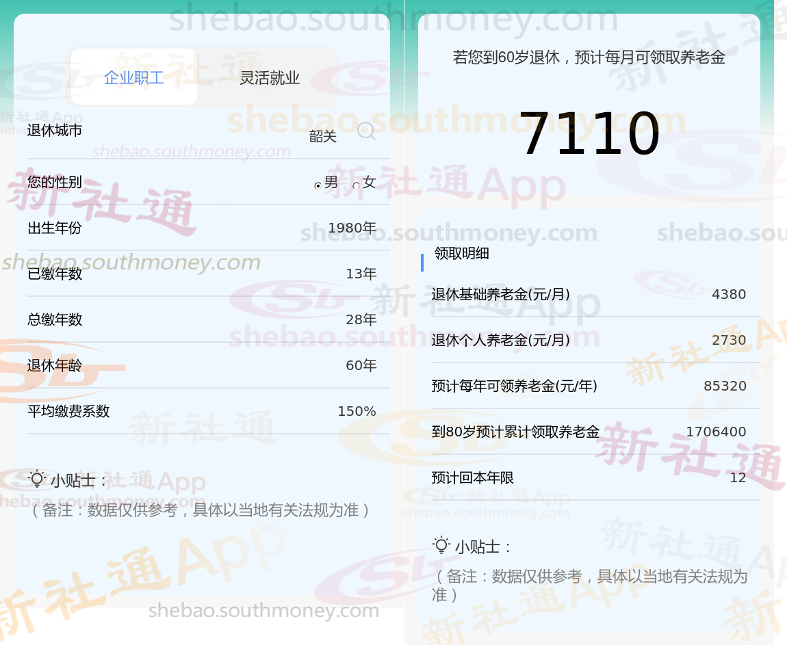 通过新社通APP-养老金计算所得:退休城市、出生年份、退休年龄、缴费系数都相同的情况下,社保缴费年限累计28年时,计算如下: