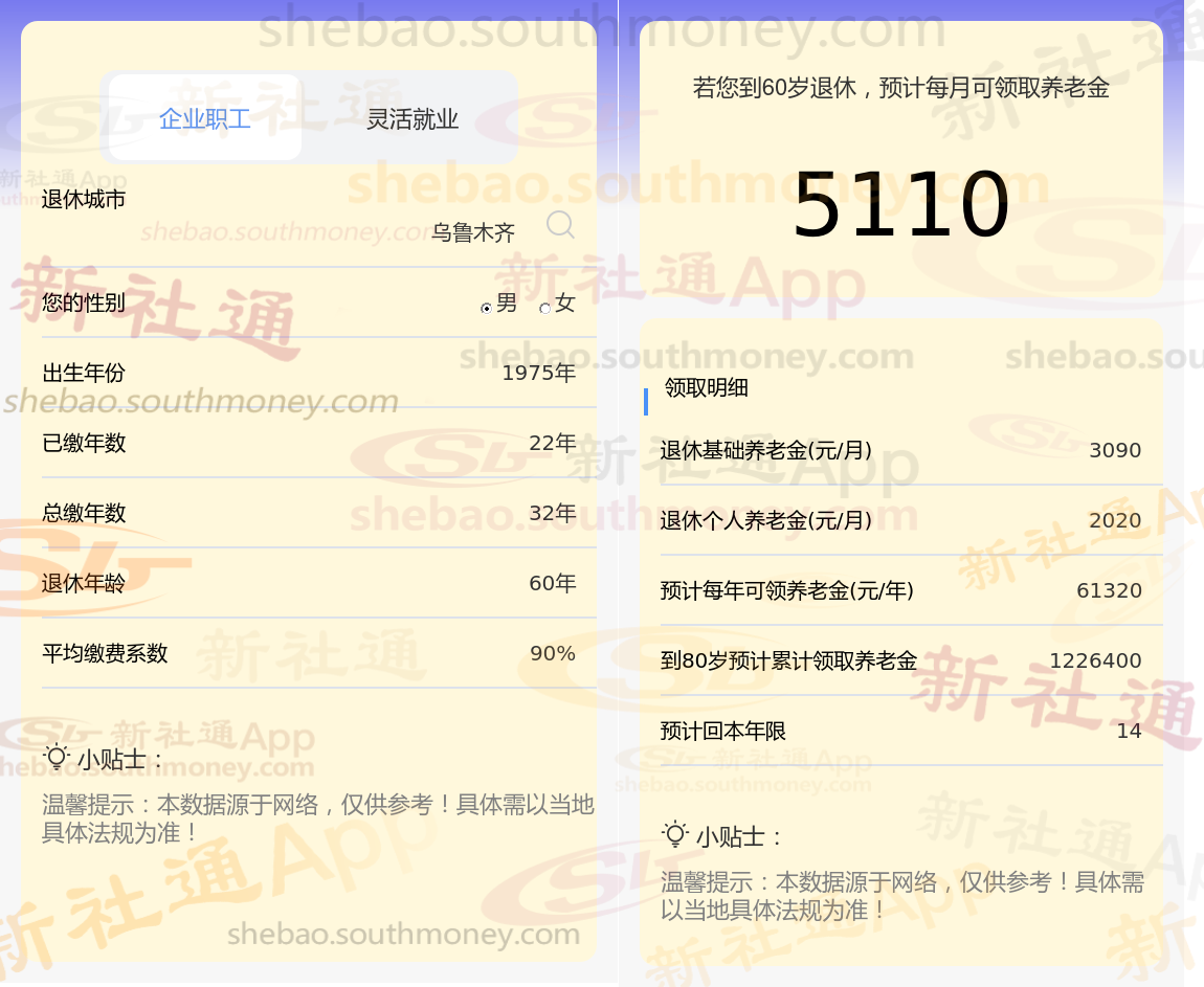 通过新社通APP-养老金计算所得:退休城市、出生年份、退休年龄、缴费系数都相同的情况下,社保缴费年限累计32年时,计算如下: