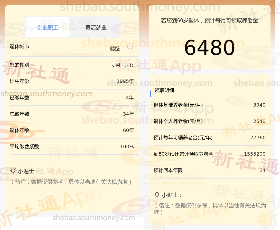 通过新社通APP-养老金计算所得:退休城市、出生年份、退休年龄、缴费系数都相同的情况下,社保缴费年限累计34年时,计算如下: