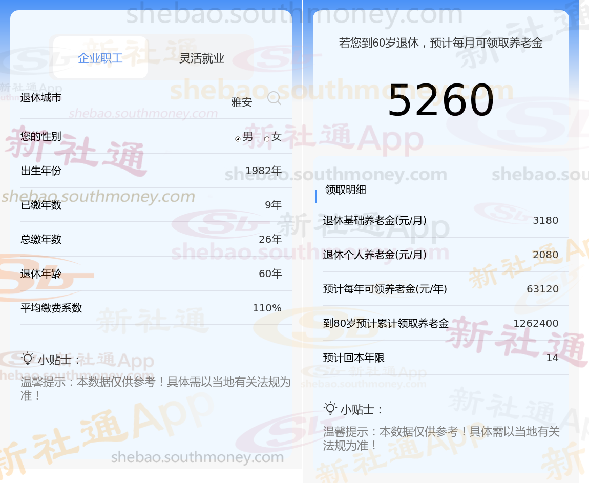 通过新社通APP-养老金计算所得:退休城市、出生年份、退休年龄、缴费系数都相同的情况下,社保缴费年限累计26年时,计算如下: