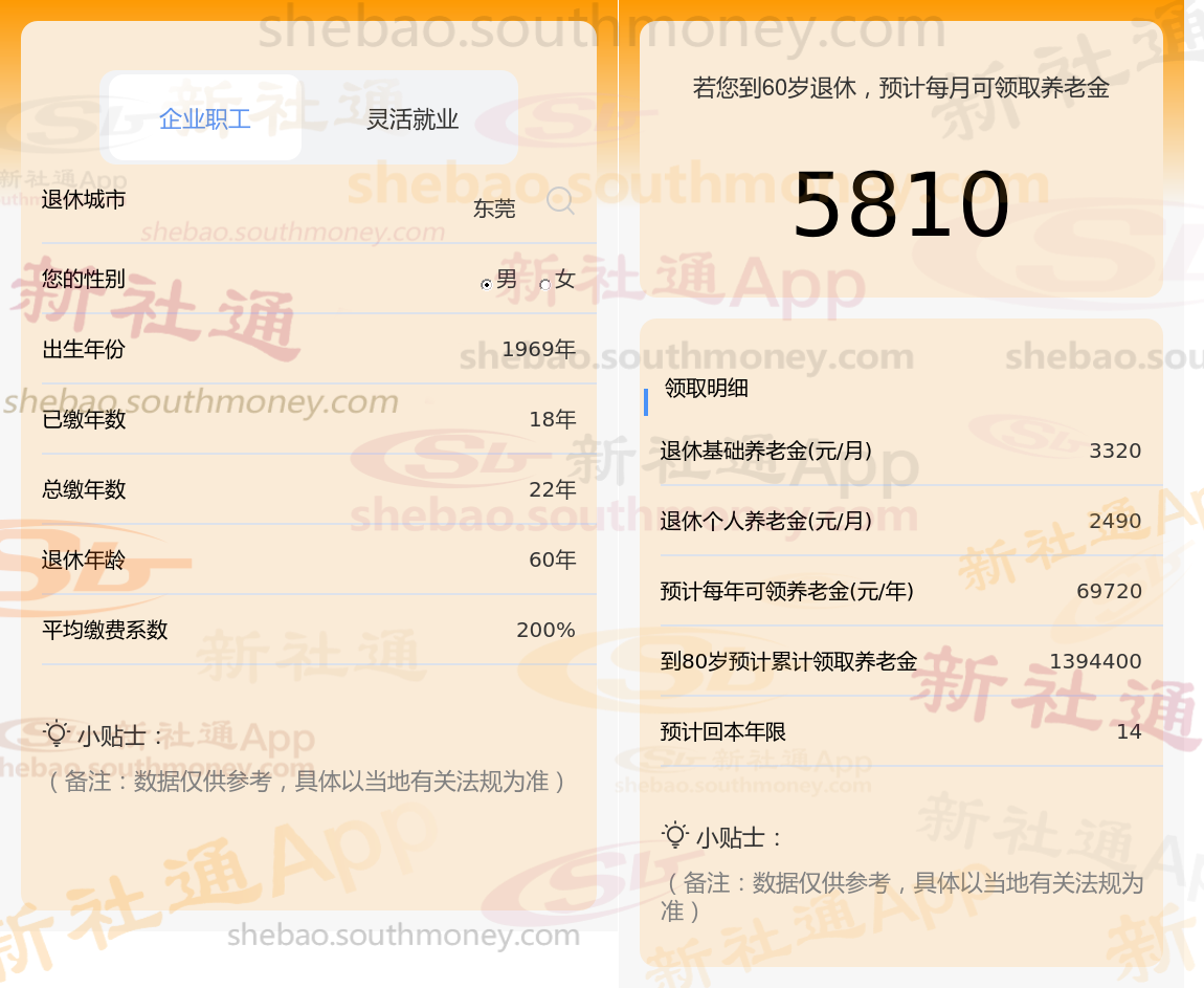 通过新社通APP-养老金计算所得:退休城市、出生年份、退休年龄、缴费系数都相同的情况下,社保缴费年限累计22年时,计算如下: