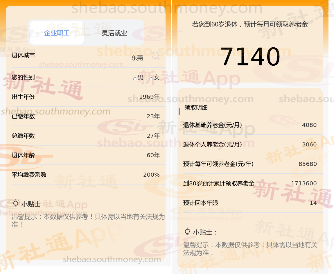 通过新社通APP-养老金计算所得:退休城市、出生年份、退休年龄、缴费系数都相同的情况下,社保缴费年限累计27年时,计算如下: