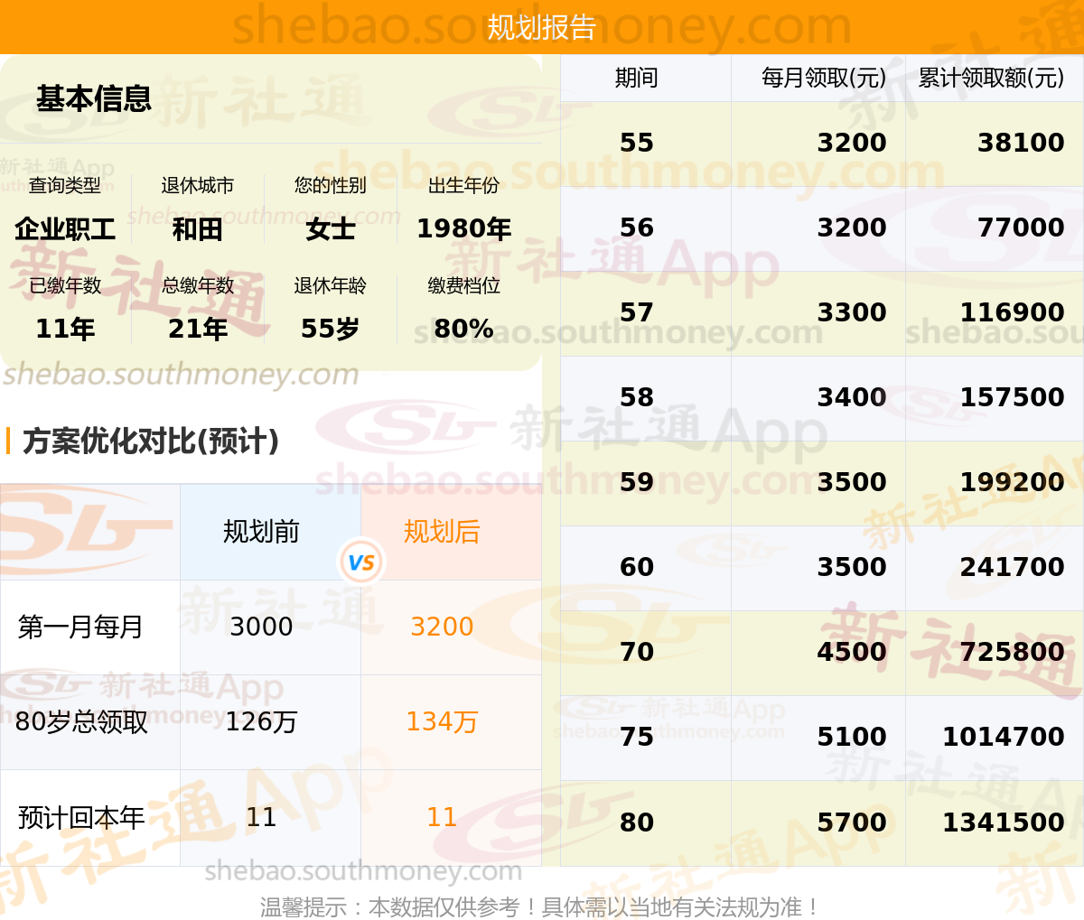 规划前:55岁第一个月约领3000元,新社通APP-养老金规划后:55岁第一个月约领3200元