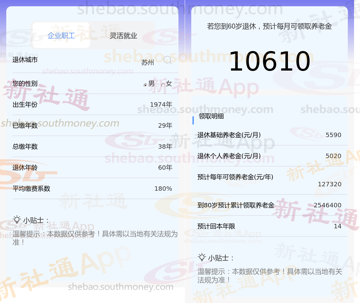 通过新社通APP-养老金计算所得:退休城市、出生年份、退休年龄、缴费系数都相同的情况下,社保缴费年限累计38年时,计算如下: