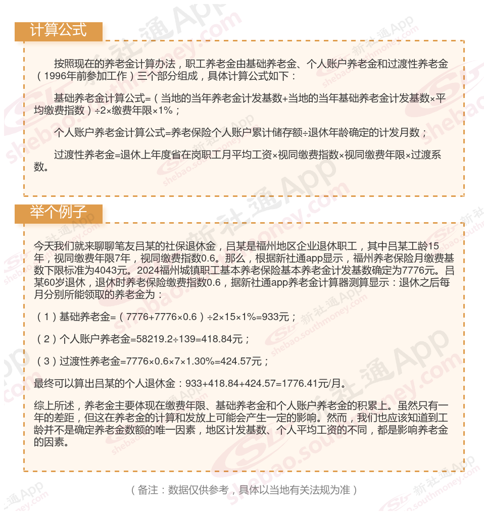 月基本养老金还包括过渡性养老金,其计算公式为:退休时上年度全省在岗职工月平均工资×本人平均缴费工资指数×1997年12月31日前的缴费期限×1.4%。