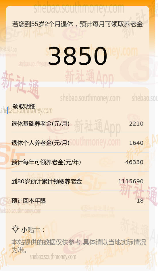 每月可领养老金=基础养老金+个人养老金≈2210+1640≈3850元。