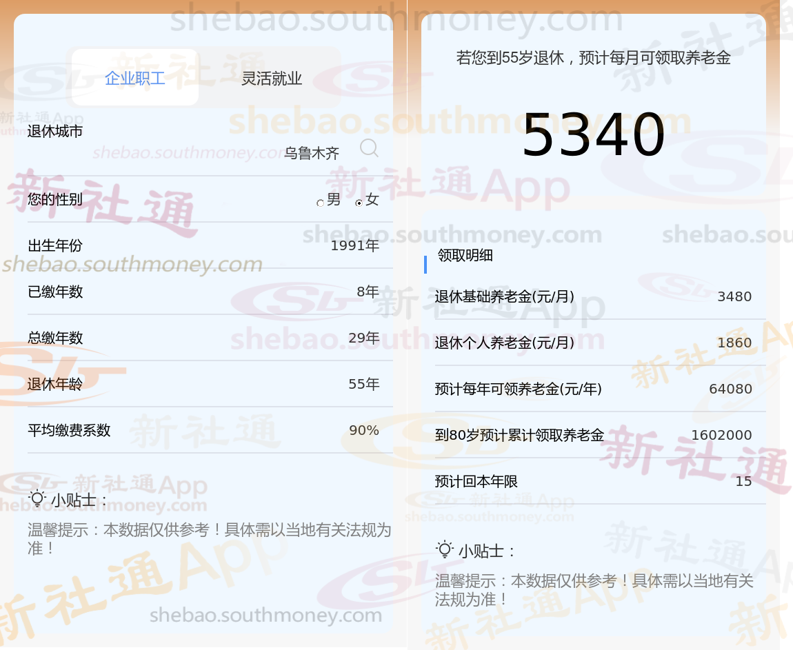 通过新社通APP-养老金计算所得:退休城市、出生年份、退休年龄、缴费系数都相同的情况下,社保缴费年限累计33年时,计算如下:
