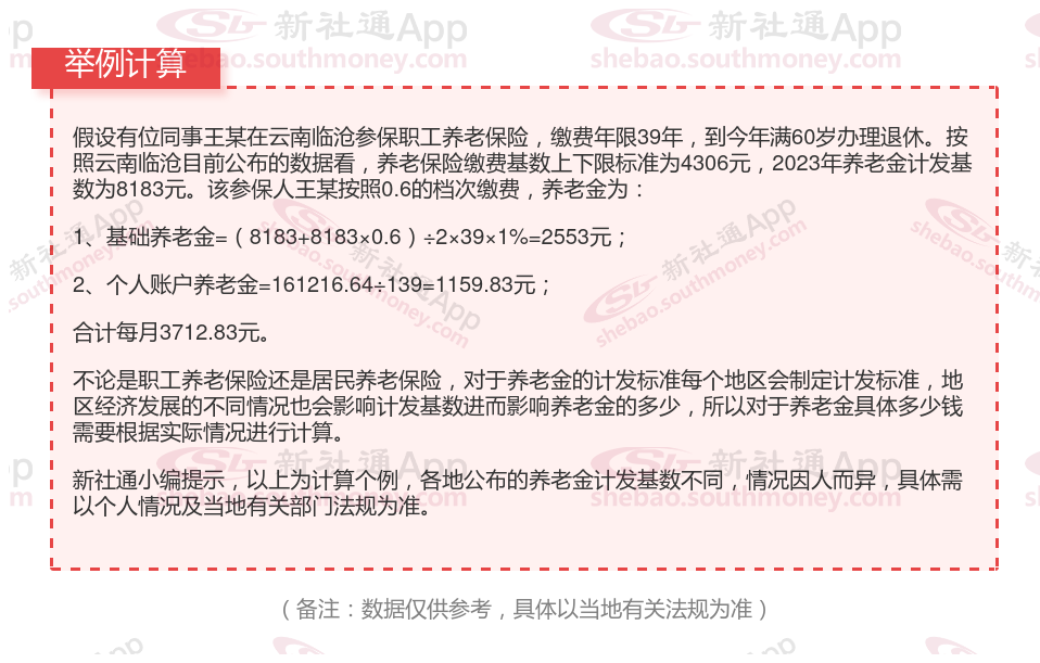 假设,参保人A是云南临沧地区企业退休职工,其中参保人A工龄30年,视同缴费年限9年,视同缴费指数0.6。那么,根据消息显示,云南临沧养老保险月缴费基数下限标准为4306元。2024云南临沧城镇职工基本养老保险基本养老金计发基数确定为8183元。参保人60岁退休,退休时养老保险缴费指数0.6,据新社通app养老金计算器测算显示:退休之后每月分别所能领取的养老金为: