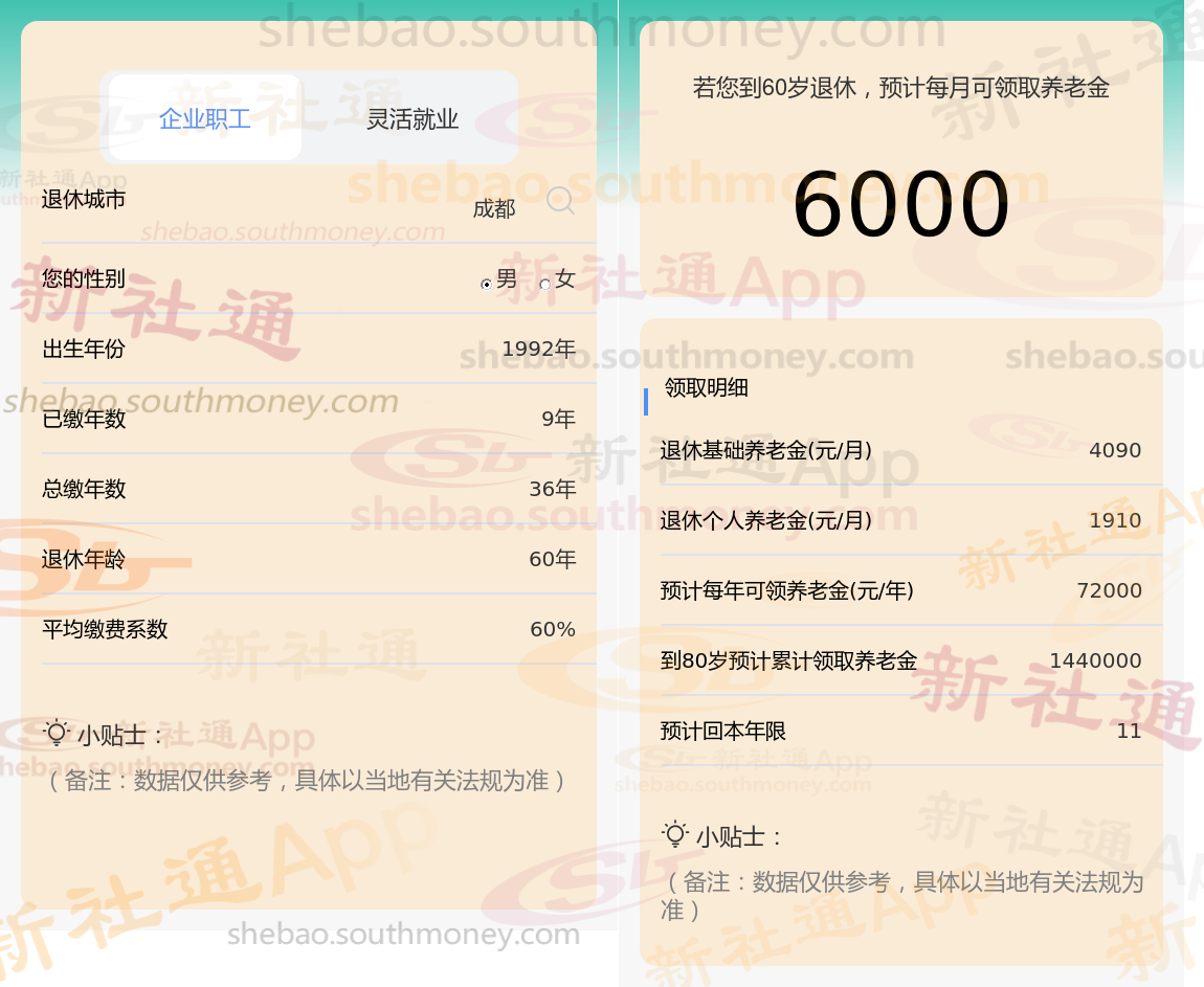 通过新社通APP-养老金计算所得:退休城市、出生年份、退休年龄、缴费系数都相同的情况下,社保缴费年限累计36年时,计算如下: