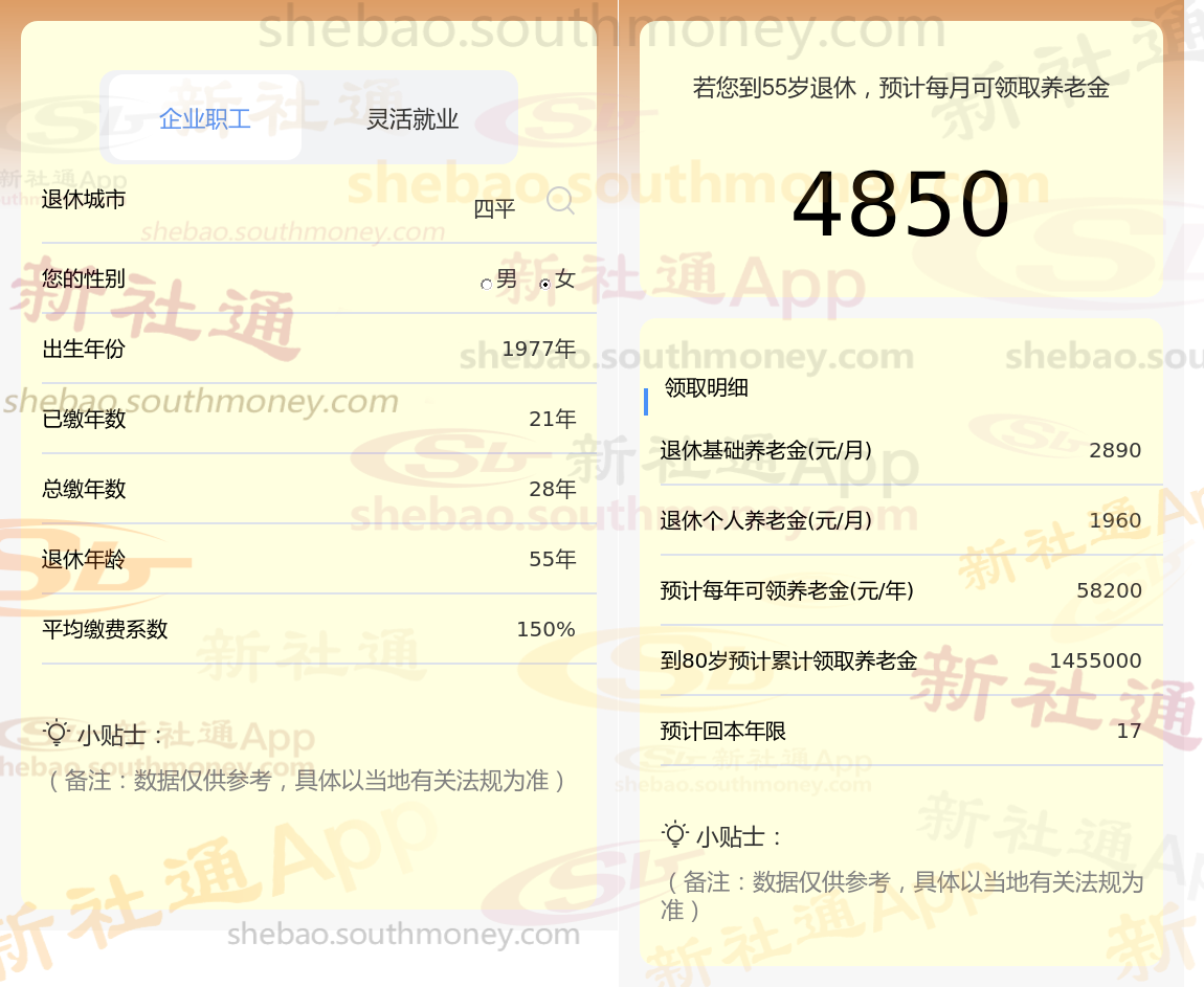 通过新社通APP-养老金计算所得:退休城市、出生年份、退休年龄、缴费系数都相同的情况下,社保缴费年限累计30年时,计算如下: