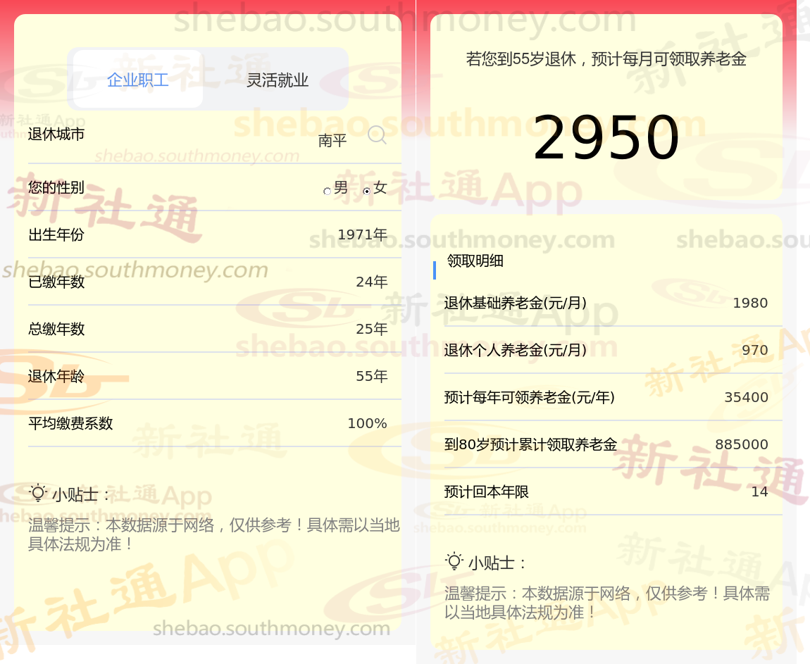 通过新社通APP-养老金计算所得:退休城市、出生年份、退休年龄、缴费系数都相同的情况下,社保缴费年限累计29年时,计算如下: