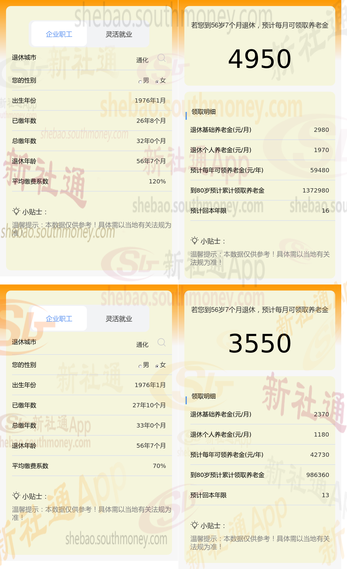 根据新社通app养老金计算器,轻松测算您的养老金!计算所得出:柯某与老赵的差别,缴费年限、缴费档位不同的情况下,差别4950-3550=1400元。