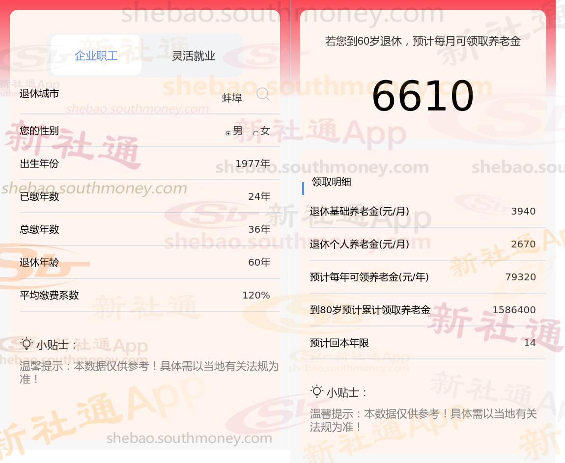 通过新社通APP-养老金计算所得:退休城市、出生年份、退休年龄、缴费系数都相同的情况下,社保缴费年限累计36年时,计算如下: