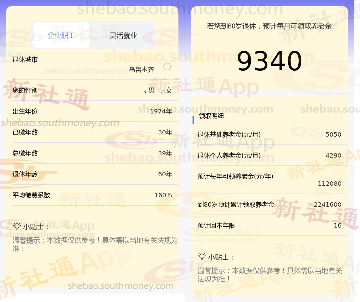 通过新社通APP-养老金计算所得:退休城市、出生年份、退休年龄、缴费系数都相同的情况下,社保缴费年限累计30年时,计算如下: