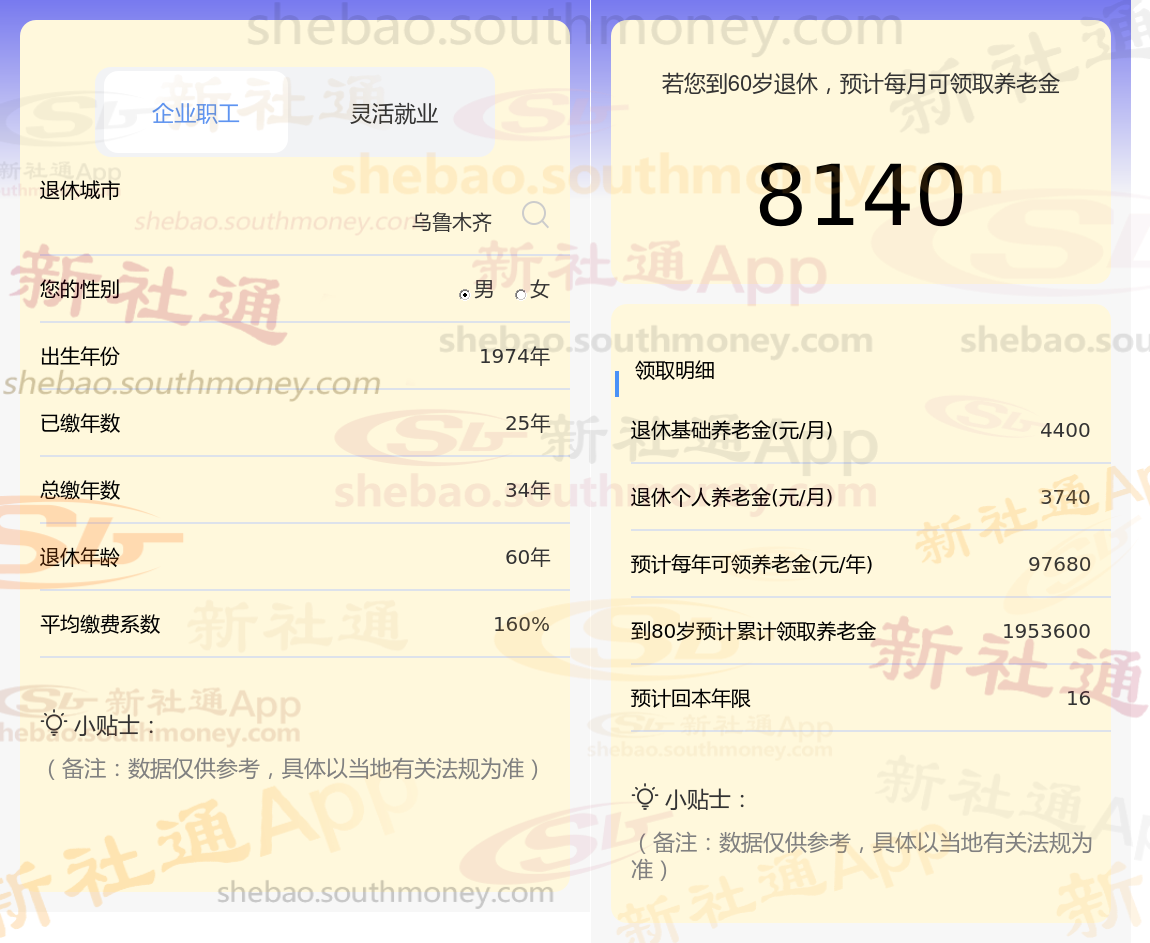 通过新社通APP-养老金计算所得:退休城市、出生年份、退休年龄、缴费系数都相同的情况下,社保缴费年限累计34年时,计算如下:
