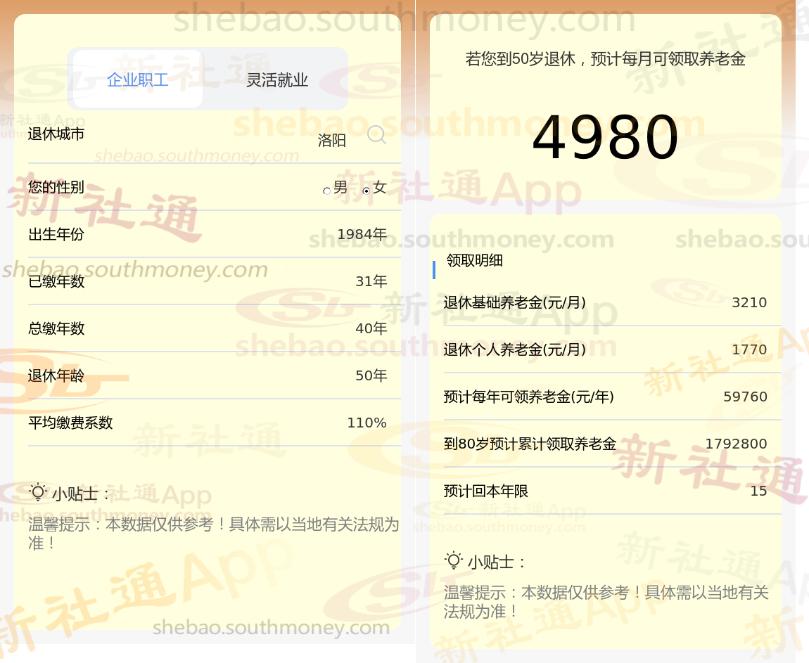 通过新社通APP-养老金计算所得:退休城市、出生年份、退休年龄、缴费系数都相同的情况下,社保缴费年限累计40年时,计算如下: