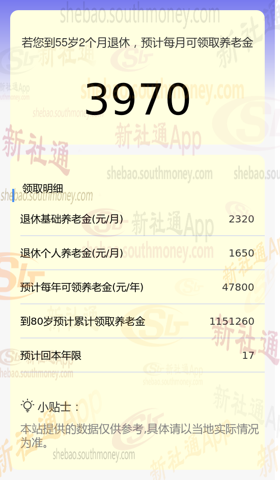 总养老金金额:两者合计,您每月可领取的养老金总额为3970元/月。