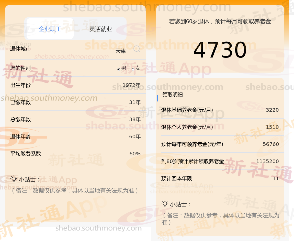 通过新社通APP-养老金计算所得:退休城市、出生年份、退休年龄、缴费系数都相同的情况下,社保缴费年限累计38年时,计算如下: