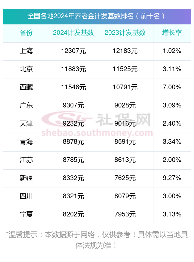 据新社通app显示,上海位列第一位,养老金计发基数达到12307.00元,增长率为1.02%;