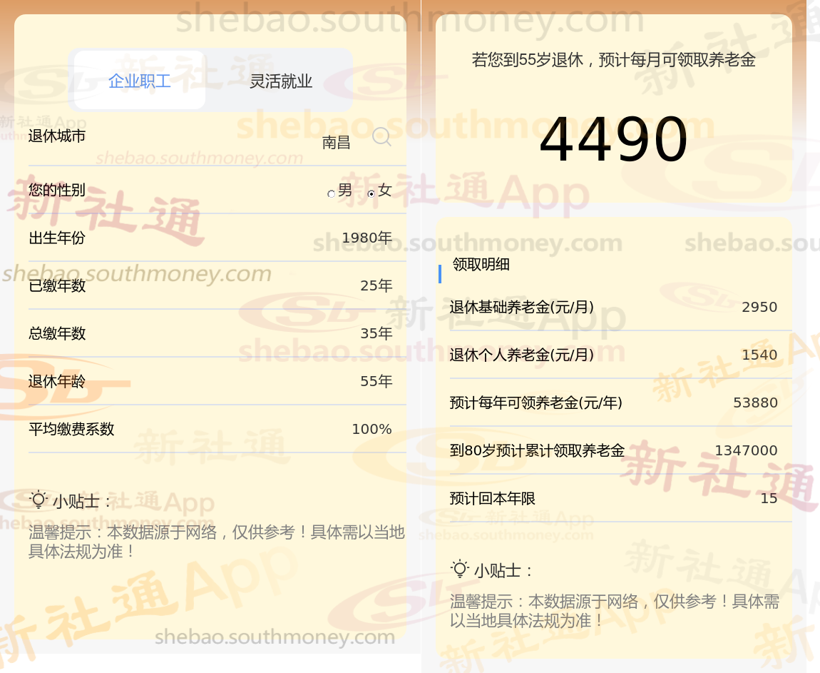 通过新社通APP-养老金计算所得:退休城市、出生年份、退休年龄、缴费系数都相同的情况下,社保缴费年限累计35年时,计算如下: