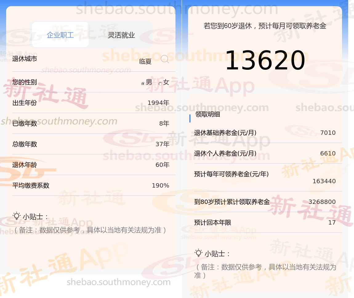 通过新社通APP-养老金计算所得:退休城市、出生年份、退休年龄、缴费系数都相同的情况下,社保缴费年限累计37年时,计算如下: