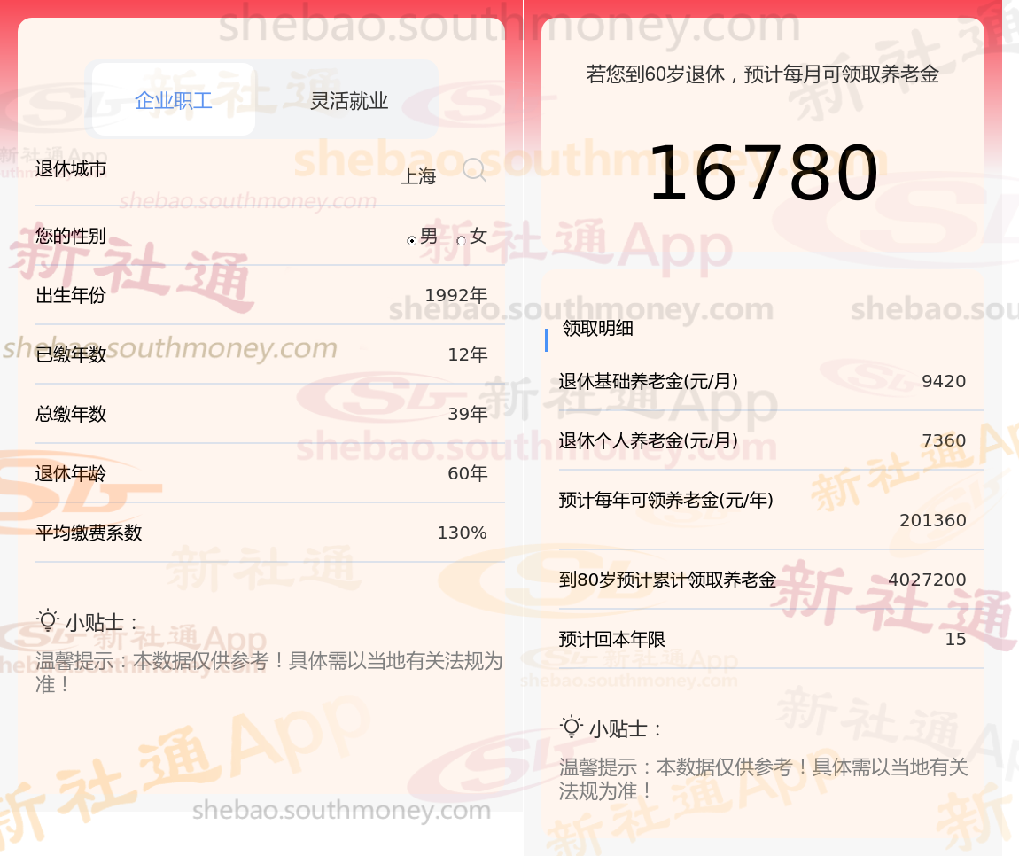 通过新社通APP-养老金计算所得:退休城市、出生年份、退休年龄、缴费系数都相同的情况下,社保缴费年限累计39年时,计算如下: