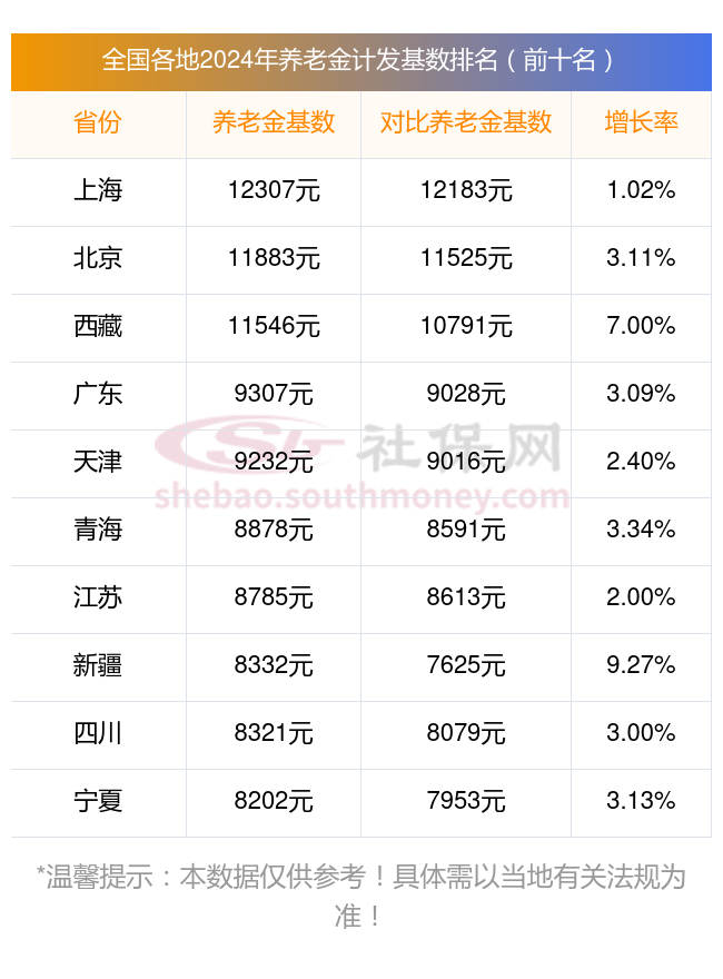 据新社通app显示,上海位列第一位,养老金计发基数达到12307.00元,增长率为1.02%;