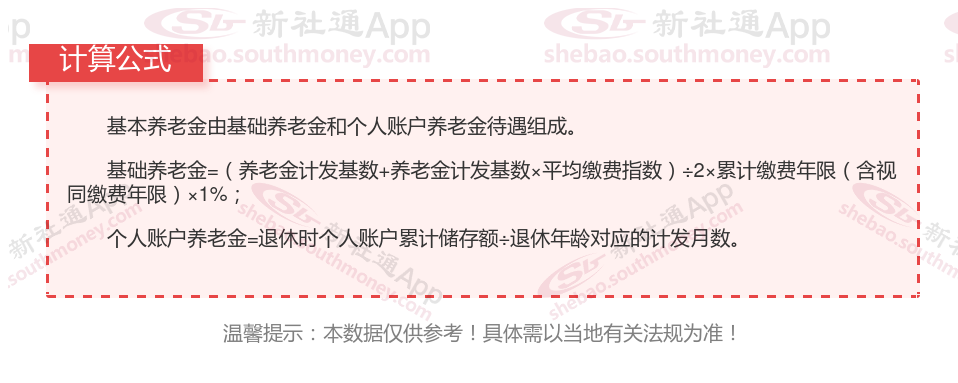 基础养老金:其计算公式为(全省上年度在岗职工月平均工资+本人指数化月平均缴费工资)÷2×缴费年限×1%。其中,本人指数化月平均缴费工资=全省上年度在岗职工月平均工资×本人平均缴费指数(本人平均缴费指数最高为300%,最低为60%,指数在0.6~3之间)。