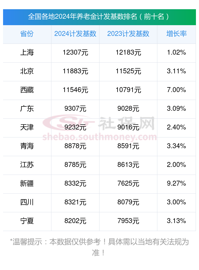 据新社通app显示,下面来看看全国各地2024年养老金计发基数一览表(前十名)