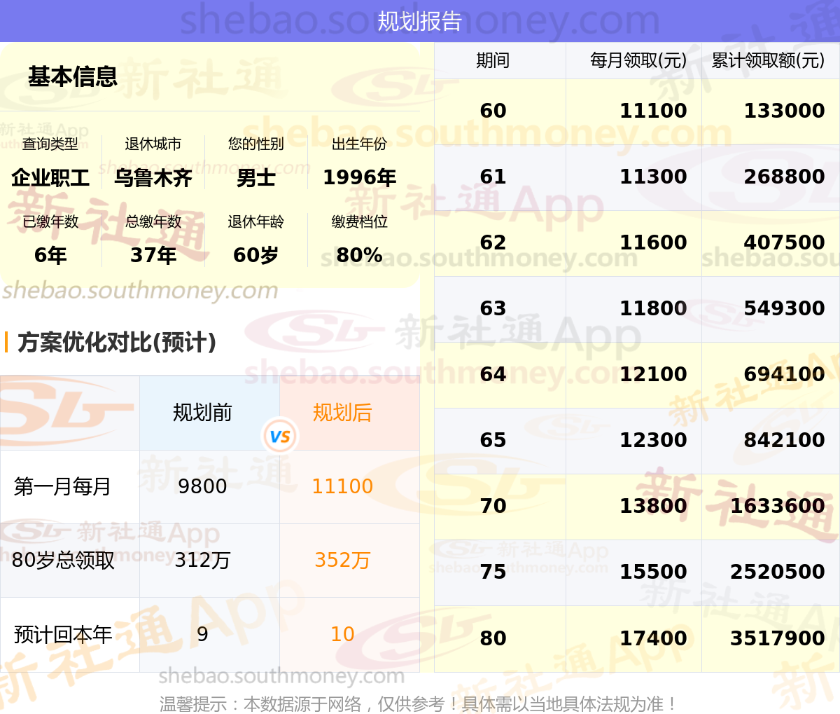 规划前:参保城市:乌鲁木齐,性别:男士,出生年月:1996,已缴年限:6年,总缴年数:37年,退休年龄:60岁,缴费档位:80%。