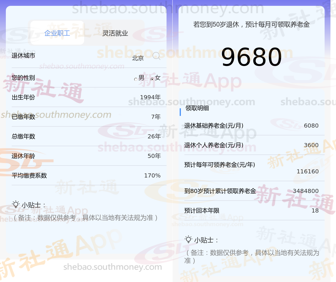 通过新社通APP-养老金计算所得:退休城市、出生年份、退休年龄、缴费系数都相同的情况下,社保缴费年限累计26年时,计算如下: