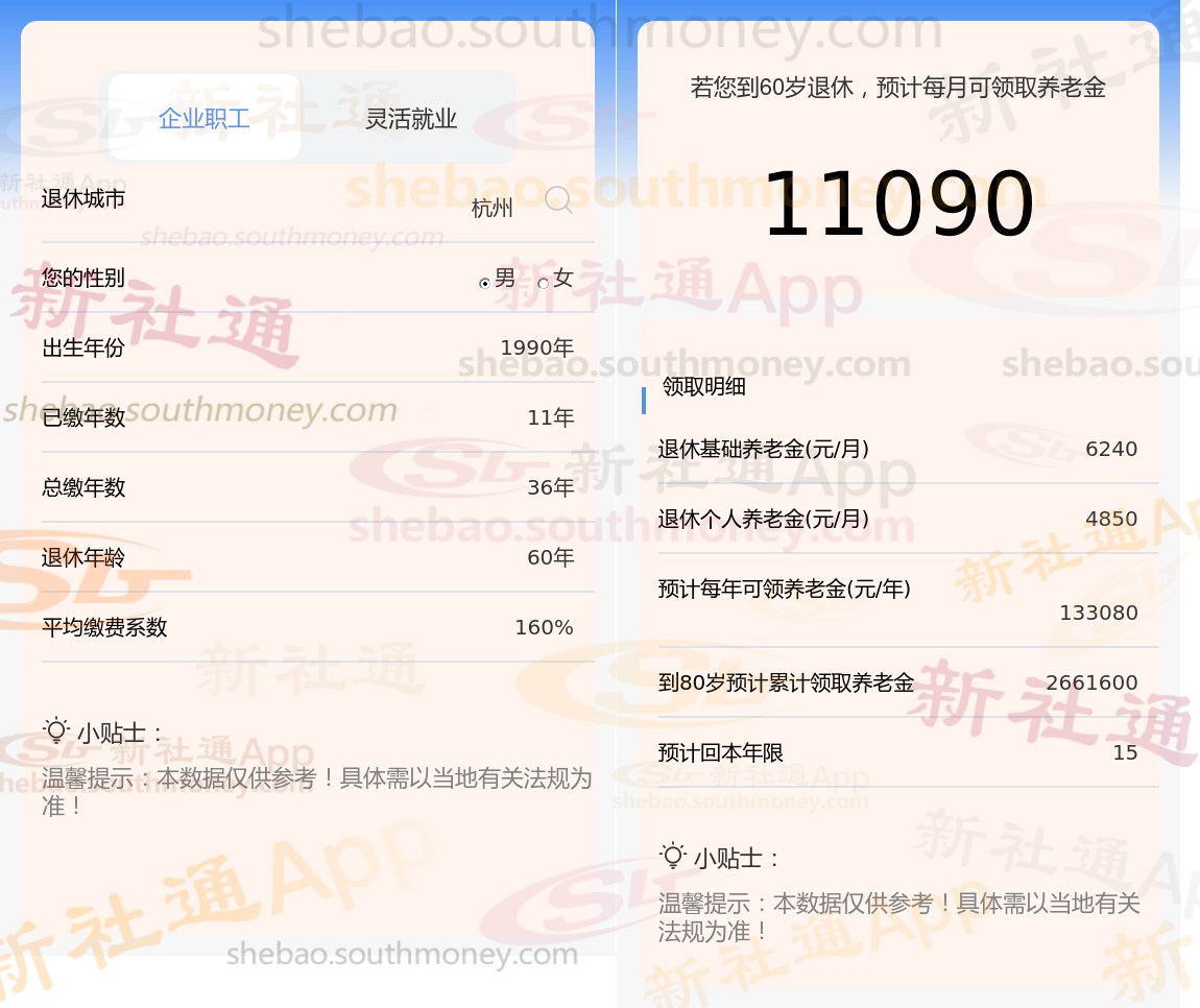 通过新社通APP-养老金计算所得:退休城市、出生年份、退休年龄、缴费系数都相同的情况下,社保缴费年限累计36年时,计算如下: