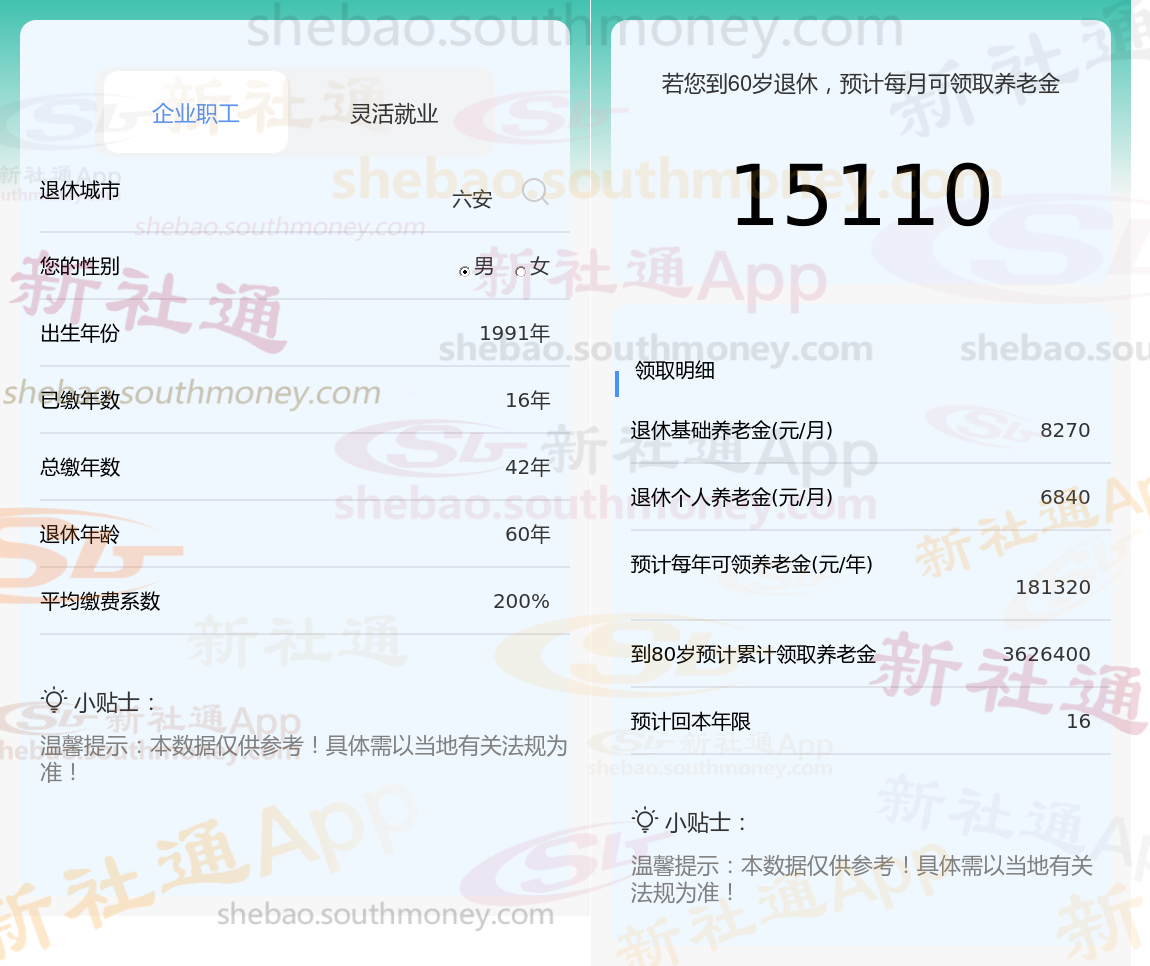 通过新社通APP-养老金计算所得:退休城市、出生年份、退休年龄、缴费系数都相同的情况下,社保缴费年限累计42年时,计算如下: