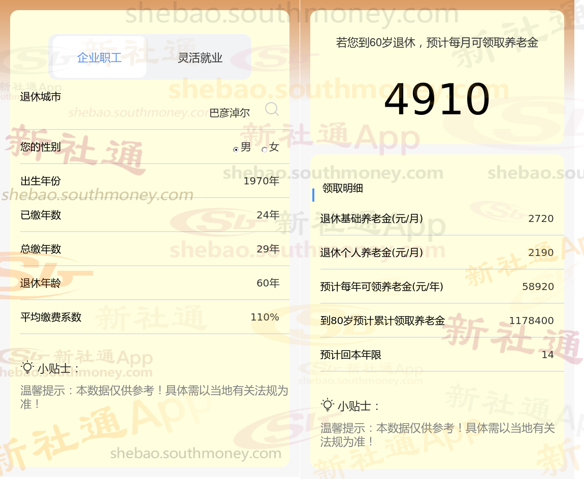 通过新社通APP-养老金计算所得:退休城市、出生年份、退休年龄、缴费系数都相同的情况下,社保缴费年限累计29年时,计算如下: