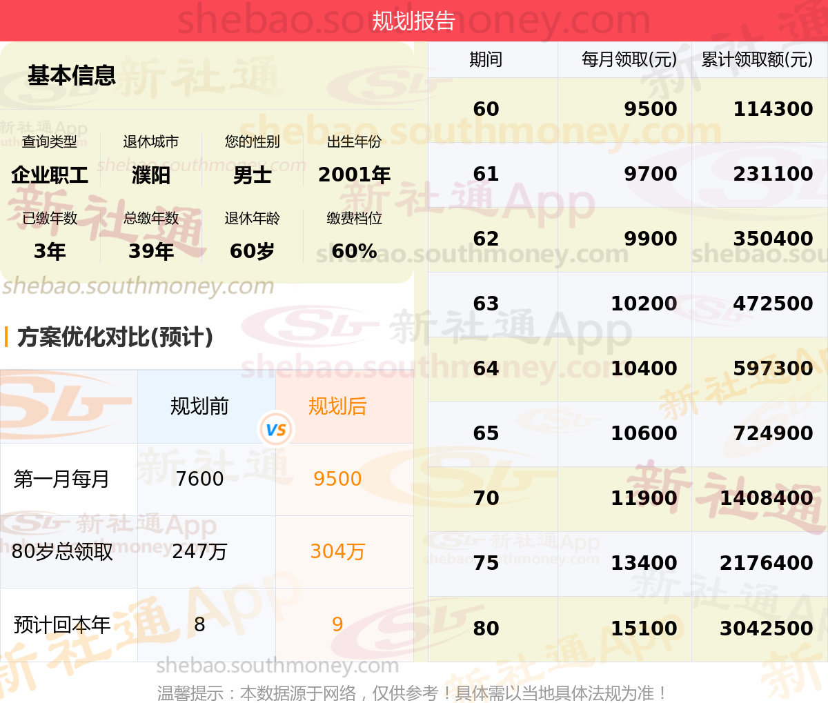 规划前:60岁第一个月约领7600元,新社通APP-养老金规划后:60岁第一个月约领9500元