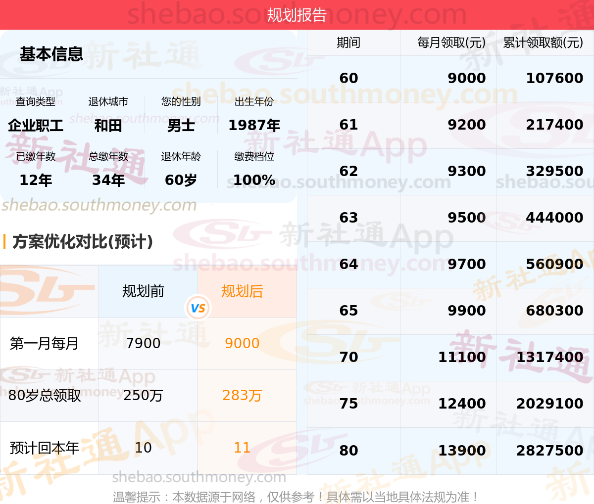规划前:60岁第一个月约领7900元,新社通APP-养老金规划后:60岁第一个月约领9000元