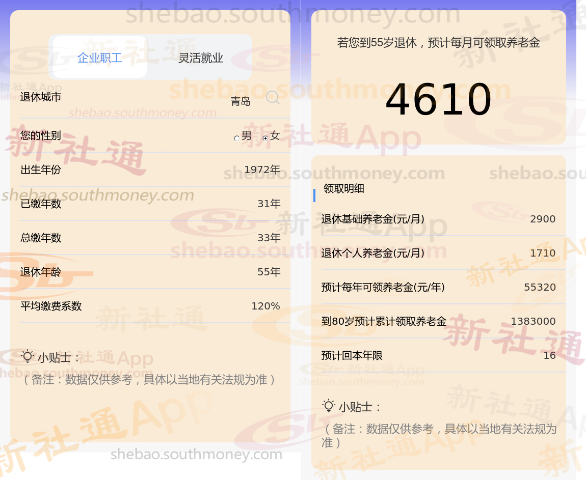 通过新社通APP-养老金计算所得:退休城市、出生年份、退休年龄、缴费系数都相同的情况下,社保缴费年限累计33年时,计算如下: