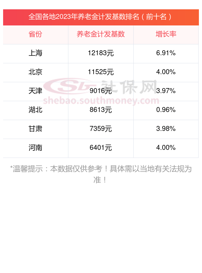 据新社通app显示,下面来看看全国各地2024年养老金计发基数增长率排名(前十名)
