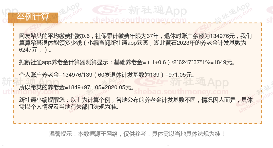 我们用湖北黄石退休网友举个例子说明一下,湖北黄石2023年的养老金计发基数为6247元,个人平均缴费指数0.6,该网友累计缴费年限为41年,退休时账户余额为149568元,我们算算这位网友退休能领多少钱。