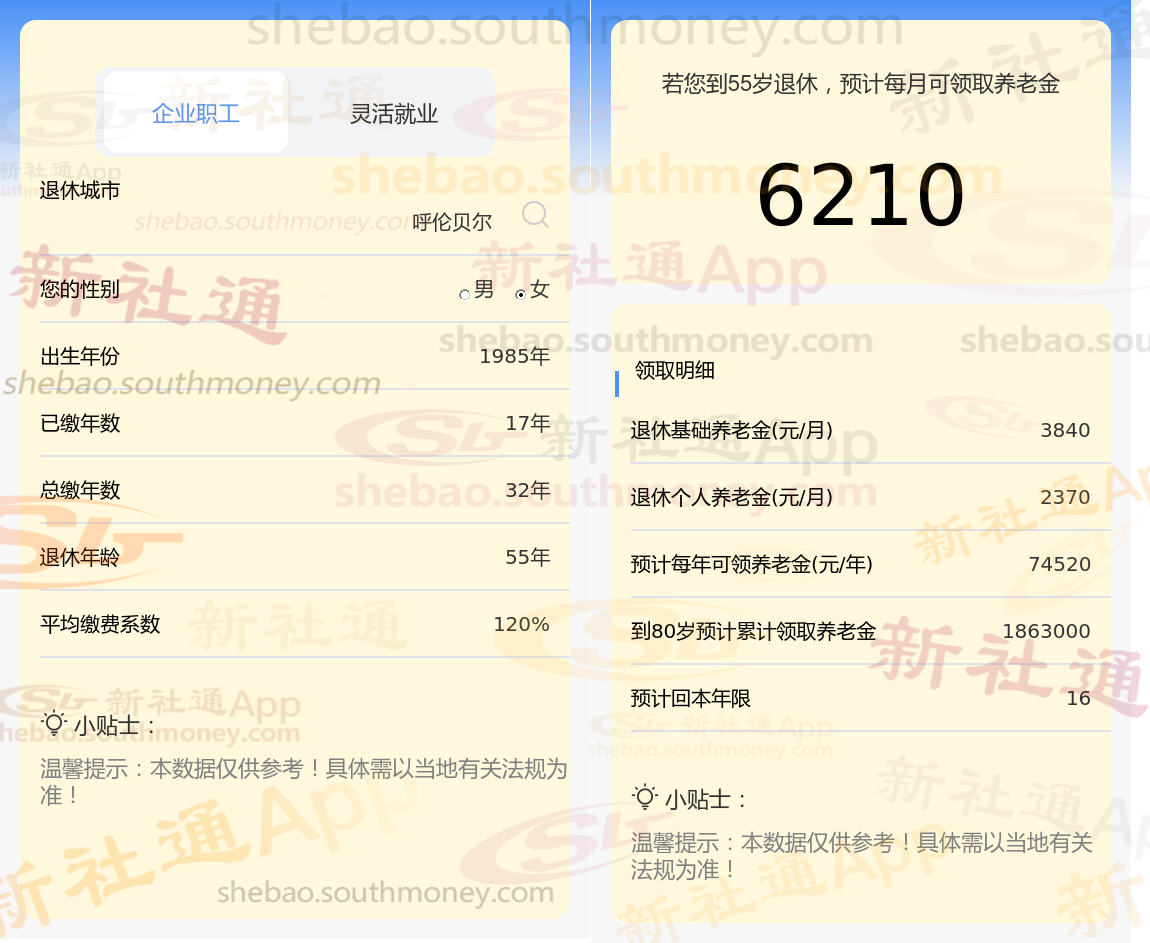 通过新社通APP-养老金计算所得:退休城市、出生年份、退休年龄、缴费系数都相同的情况下,社保缴费年限累计32年时,计算如下: