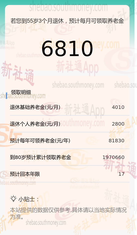 朋友张某退休城市在湖南怀化,性别:女,出生年份:1970,总缴年数34年,缴费档次:210%