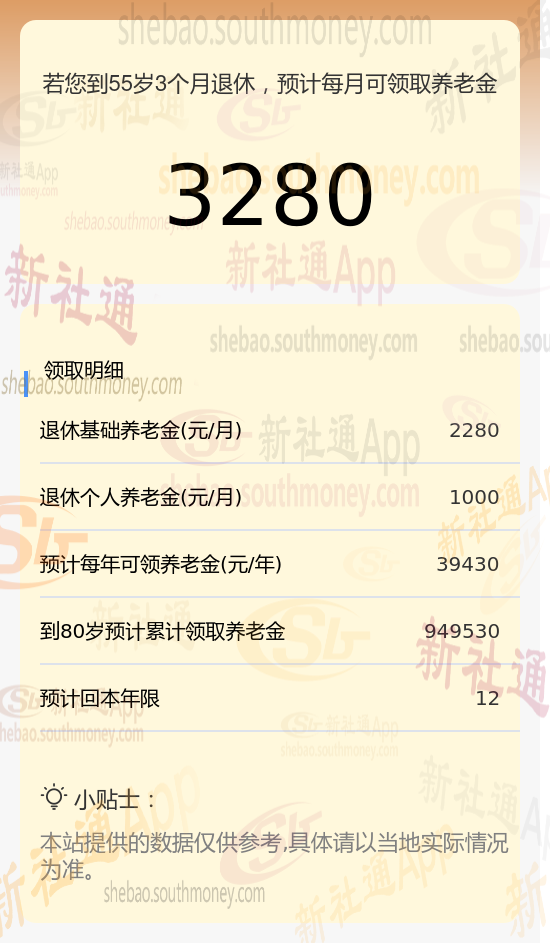 基础退休金:基本养老金计算公式为:(退休时上年度全市城镇单位就业人员月平均工资+本人指数化月平均缴费工资)÷2×缴费年限×1%。通过公式计算出每月大约2280元。