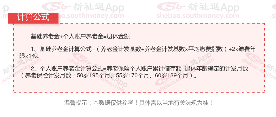 基础养老金=[(参保人员退休时全区上年度城镇单位在岗职工月平均工资+本人指数化月平均缴费工资)÷2]×缴费年限×1%。
