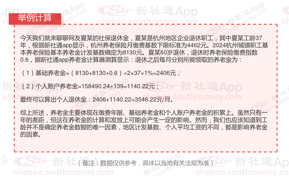 假设,参保人A是杭州地区企业退休职工,其中参保人A工龄41年,视同缴费年限6年,视同缴费指数0.6。那么,根据消息显示,杭州养老保险月缴费基数下限标准为4462元。2024杭州城镇职工基本养老保险基本养老金计发基数确定为8130元。参保人60岁退休,退休时养老保险缴费指数0.6,据新社通app养老金计算器测算显示:退休之后每月分别所能领取的养老金为: