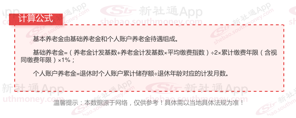 基础养老金为:上一年退休地在岗职工月平均工资(1 个人平均缴费指数)÷2×累计缴费年限(含视为缴费年限)×1%。每月大约3470元。